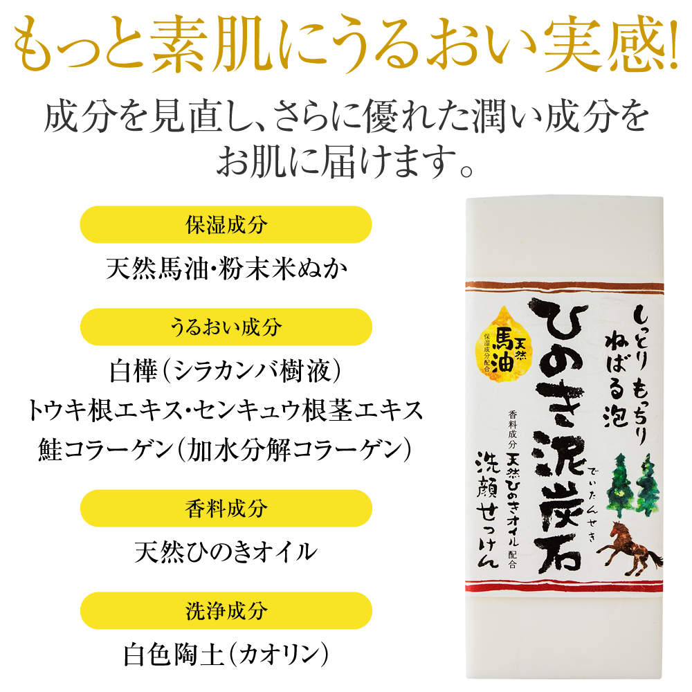 ・黒い「ひのき泥炭石」のさっぱり成分である炭や泥の替わりに、保湿成分の天然馬油と粉末米ぬか(脱脂コメヌカ)、北海道産のうるおい成分を配合。